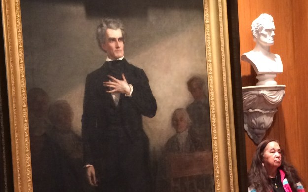 Portrait of John C. Calhoun glowers at CAJM member waiting to speak at City Council meeting
